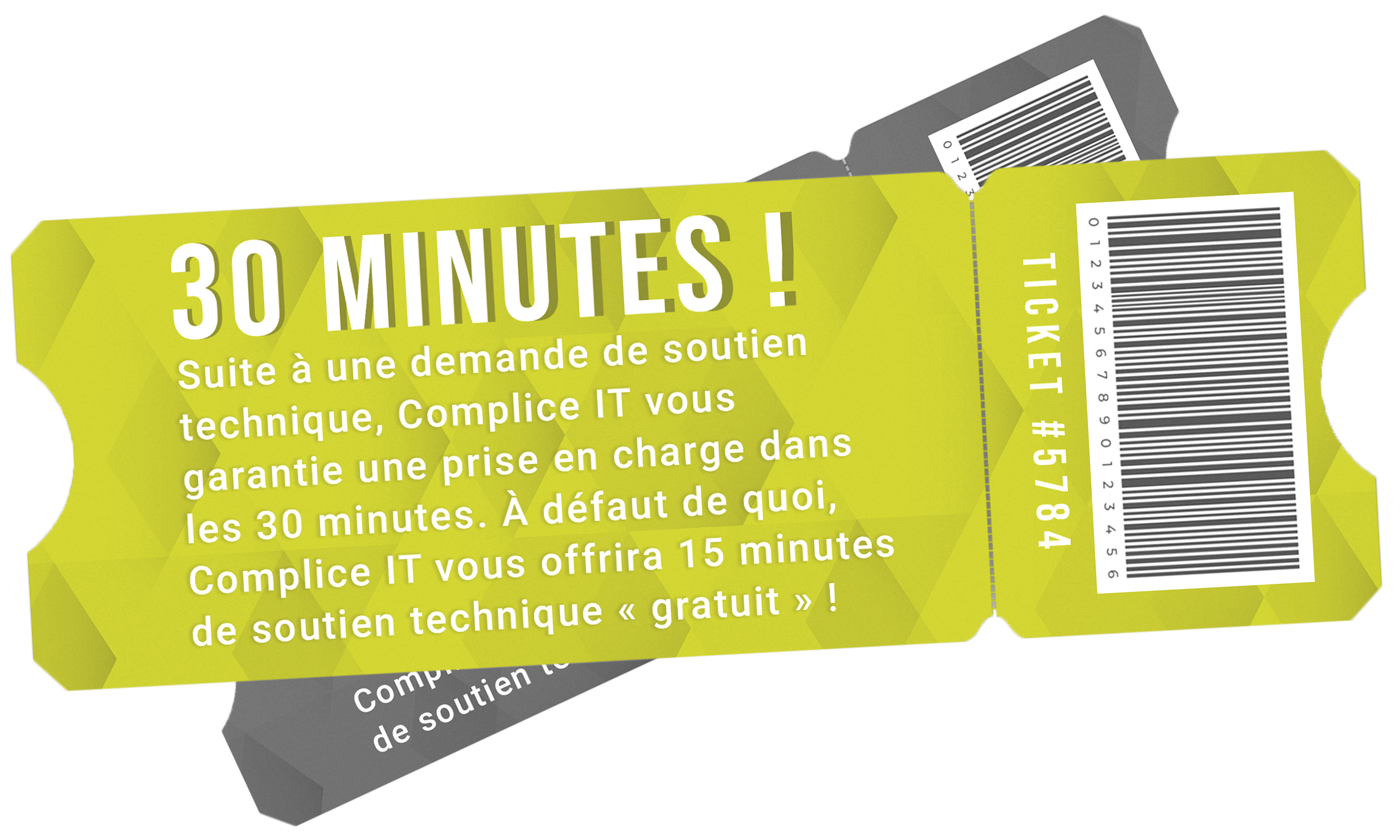 Chez Complice IT, la gestion des attentes et la rapidité de prise en charge sont prioritaires. Il est un devoir pour nous de toujours être à disposition rapidement pour vous, que vous sentiez que vous bénéficiez d’un réel support. C’est pourquoi nous garantissons maintenant une prise en charge des demandes de support en 30 minutes ou moins ! Nous sommes à l’écoute de vos besoins et nous ferons également toujours preuve d’initiative pour vous proposer des solutions justes, efficaces et novatrices ! Constamment en gardant le même objectif en tête; optimiser votre hygiène technologique afin que vous puissiez maximiser vos ressources sur ce qui compte vraiment pour votre entreprise tout en étant en pleine confiance de vos systèmes !